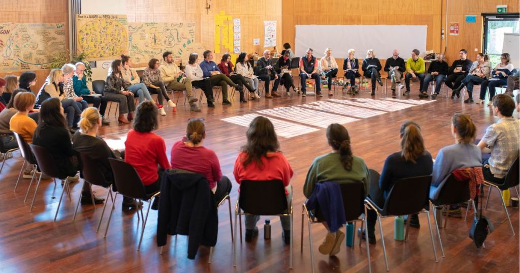 Nous utilisons des méthodologies que tout le monde connaît, comme le World Cafe, le forum ouvert, le storytelling, l’Appréciative inquiry. Il y en a quelques-unes aussi qui sont nées au sein de Art of Hosting, comme le Pro Action Café ou bien encore le Jeu de la question puissante. C’est extraordinaire comme jeu ! Il s’agit d’un dialogue entre quatre ou cinq personnes qui ne se passe que par des questions. Tu arrives avec une question dite brûlante, que tu portes au plus profond de toi (et que tu acceptes de partager), qui peut être perso ou pro. Et cette question brûlante, grâce au travail d’accompagnement bienveillant des pairs, en dialogue de questions, va trouver de la profondeur, va évoluer jusqu’à devenir une question puissante…