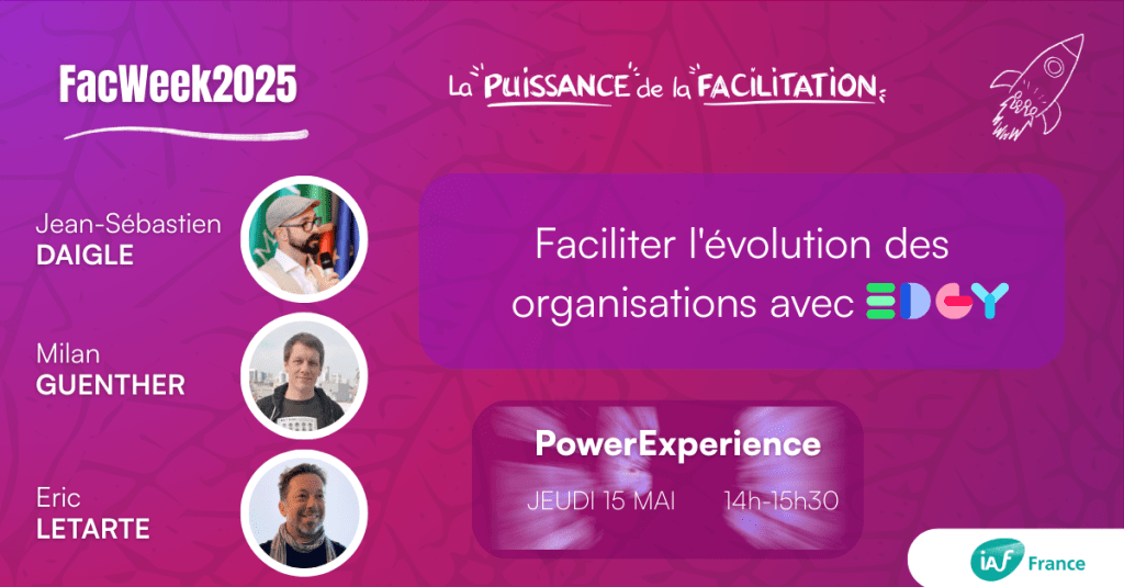 Olivier Réaud, Président IAF France et CEO d’In Principo, accueille, en direct de Berlin, Milan Guenther, Président de EDGY et coconcepteur de l’approche et, depuis Montréal, Eric Letarte et Jean-Sébastien Daigle Facilitateurs de &Friends une agence de facilitation et de design d’organisation internationale, basée au Québec.