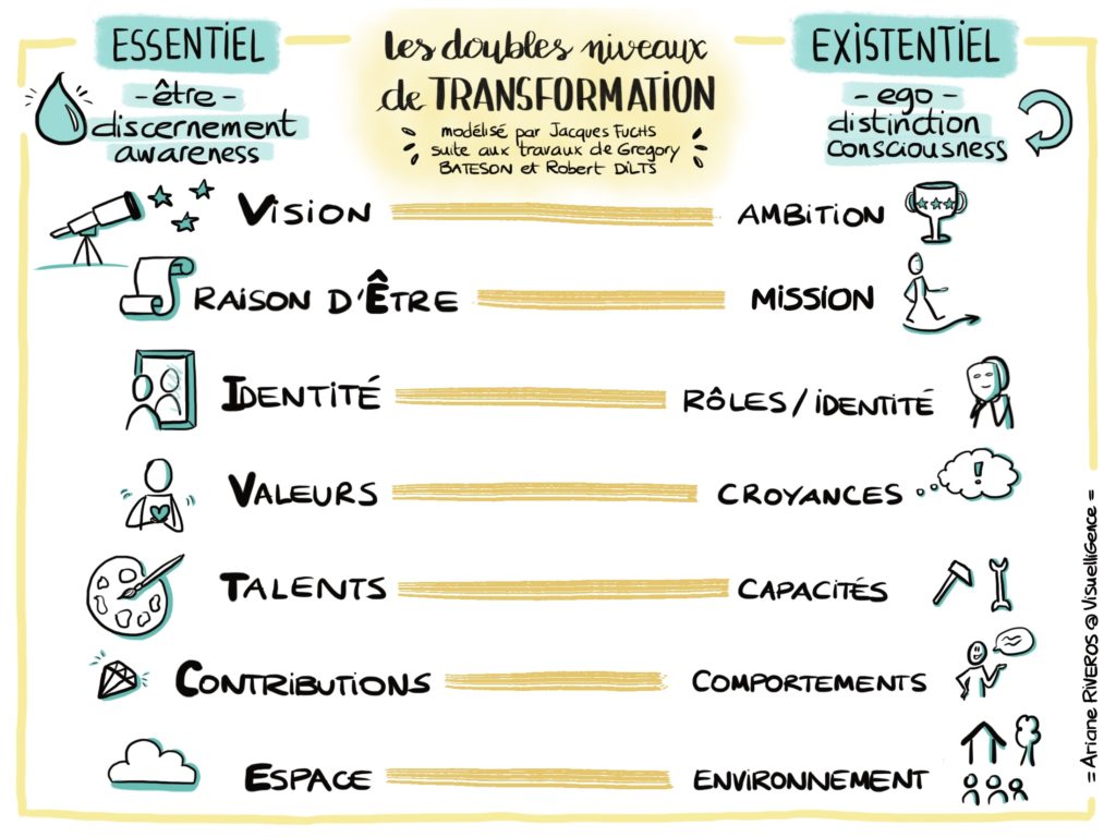 Une transformation va donc impacter sept niveaux : l’environnement, les comportements, les capacités, les valeurs/croyances (culture), les rôles:identités, les missions et les ambitions (vision stratégique). Le changement lui va opérer principalement au niveau comportemental avec plus ou moins de changement au niveau des capacités.